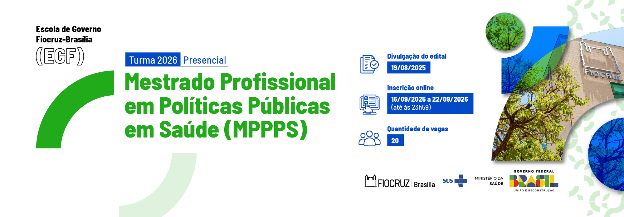 A Escola de Governo Fiocruz-Brasília publicou a chamada pública para seleção de pessoas candidatas para a 21ª turma do Mestrado Profissional em Políticas Públicas em Saúde (MPPPS). As aulas terão início em março de 2026 e as atividades desenvolvidas neste mestrado são presenciais. O curso é organizado em duas linhas de pesquisa: saúde e […]