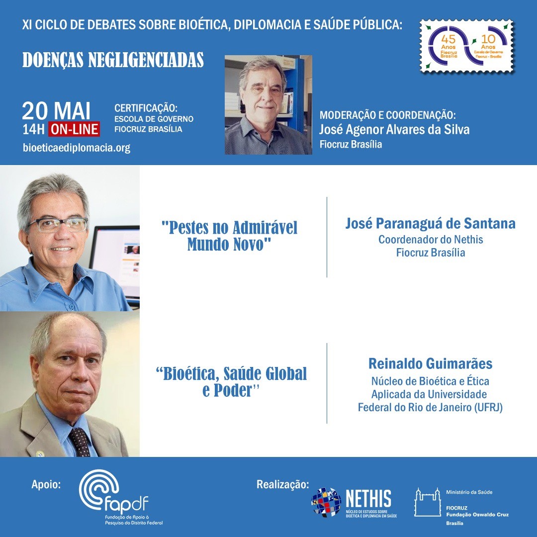 O XI Ciclo de Debates sobre Bioética, Diplomacia e Saúde Pública é promovido pelo Núcleo de Estudos em Bioética e Diplomacia em Saúde (Nethis/Fiocruz Brasília). A Fundação de Apoio à Pesquisa do Distrito Federal (FAP-DF) apoia a realização das sessões.