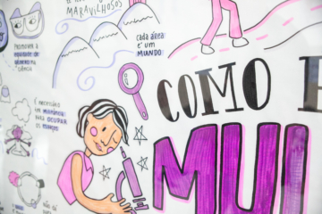 Em março do ano passado, uma atividade reuniu 118 meninas de 13 a 19 anos e 27 pesquisadoras da Fiocruz Brasília e de outras instituições de pesquisa, de diferentes áreas do conhecimento e variadas trajetórias profissionais. O encontro, em clima bastante informal, na lanchonete da Fiocruz Brasília, rendeu muitas conversas e trocas de experiências. Ao final, os conhecimentos produzidos foram sistematizados em dois grandes painéis que, por meio de desenhos e frases, convidam a refletir sobre ser mulher na ciência. Os quadros compõem agora a exposição “Mulheres e meninas na ciência”, em cartaz na Fiocruz Brasília até abril de 2024.