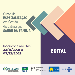 O Curso de Especialização em Gestão da Estratégia Saúde da Família, ofertado pela Escola de Governo Fiocruz – Brasília, é uma iniciativa do Programa de Qualificação da Atenção Primária à Saúde do Distrito Federal (Qualis APS), uma parceria entre a COAPS da Secretaria de Saúde do Distrito Federal, a Fiocruz Brasília e a Universidade de Brasília.