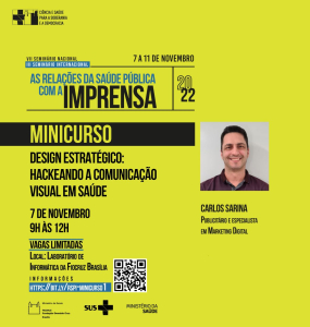 O minicurso será conduzido por Carlos Sarina, publicitário formado em Comunicação Social e especialista em Marketing Digital. Atua como designer gráfico e editorial há mais de 25 anos. Foi diretor de arte e criação em agências de publicidade de Brasília e tem clientes e trabalhos espalhados por vários países. Na Fiocruz Brasília desde 2008, atua especialmente nas temáticas de planejamento e coordenação de ações de divulgação científica. Entre os prêmios conquistados estão o Prêmio Colunistas de Brasília, prêmio nacional para a escolha do selo de luta contra a tuberculose, e prêmios internacionais de ilustração para Netflix.