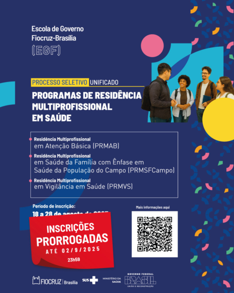 As inscrições para o processo seletivo unificado das Residências Multiprofissionais em Saúde da Escola de Governo Fiocruz – Brasília foram prorrogadas até quinta-feira, dia 02 de setembro de 2025. Ao todo, são 112 vagas, com ingresso previsto para o primeiro semestre de 2026, distribuídas entre três programas: