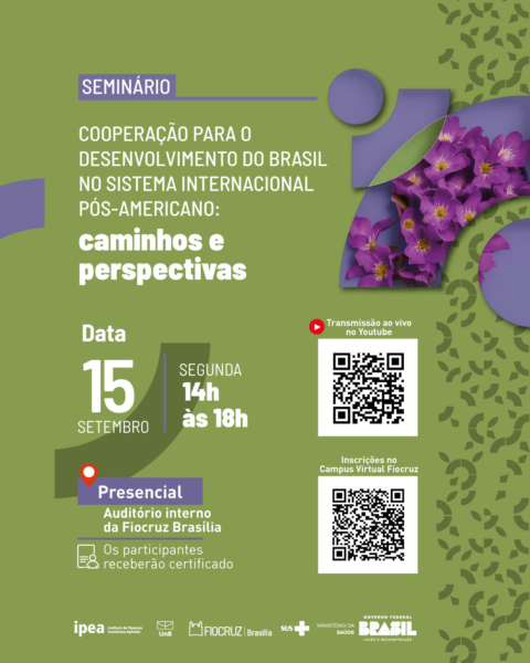 O Seminário é organizado pela Fiocruz Brasília em parceria com o Instituto de Relações Internacionais da Universidade de Brasília (IRel/UnB) e o Instituto de Pesquisa Econômica Aplicada (Ipea).