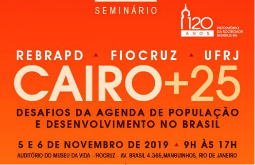 Por Simone Kabarite Costa (Fiocruz) A Fiocruz promove, em parceria com a Rede Brasileira de População e Desenvolvimento(Rebrapd) e a Universidade Federal do Rio de Janeiro (UFRJ), o Seminário Cairo +25: Desafios da agenda de População e Desenvolvimento no Brasil, no Auditório do Museu da Vida, Fiocruz (RJ). O evento, realizado nesta terça e quarta-feira, […]