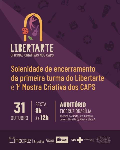 A Fiocruz Brasília, por meio do Núcleo de Educação Popular, Cuidado e Participação na Saúde (Angicos), e a Subsecretaria de Saúde Mental da Secretaria de Saúde do Distrito Federal (SES/DF) realizam, no dia 31 de outubro, a 1ª Mostra do Projeto Libertarte – Oficinas Criativas nos CAPS. O evento, que marca o encerramento da primeira edição da iniciativa, será realizado das 8h às 12h, no Bloco Educacional da Fiocruz Brasília.